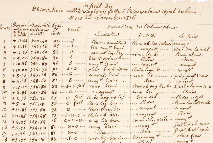 Les Archives nationales ont donc la mission de conserver un riche fonds de relevés météorologiques, dont les plus anciennes séries commencent aux années 1850. Le principal producteur de ces données confiées aux Archives nationales est bel et bien Météo-France.