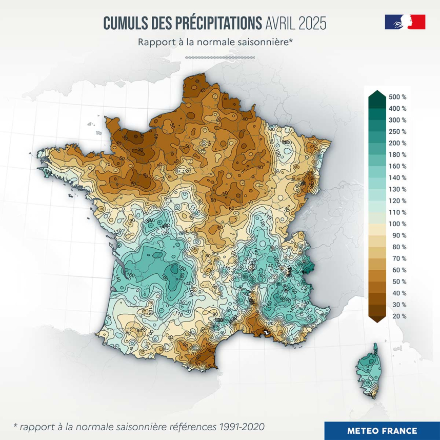 - un ensoleillement encore très excédentaire sur la moitié nord du pays comme en mars, un soleil plus timide sur la moitié sud.